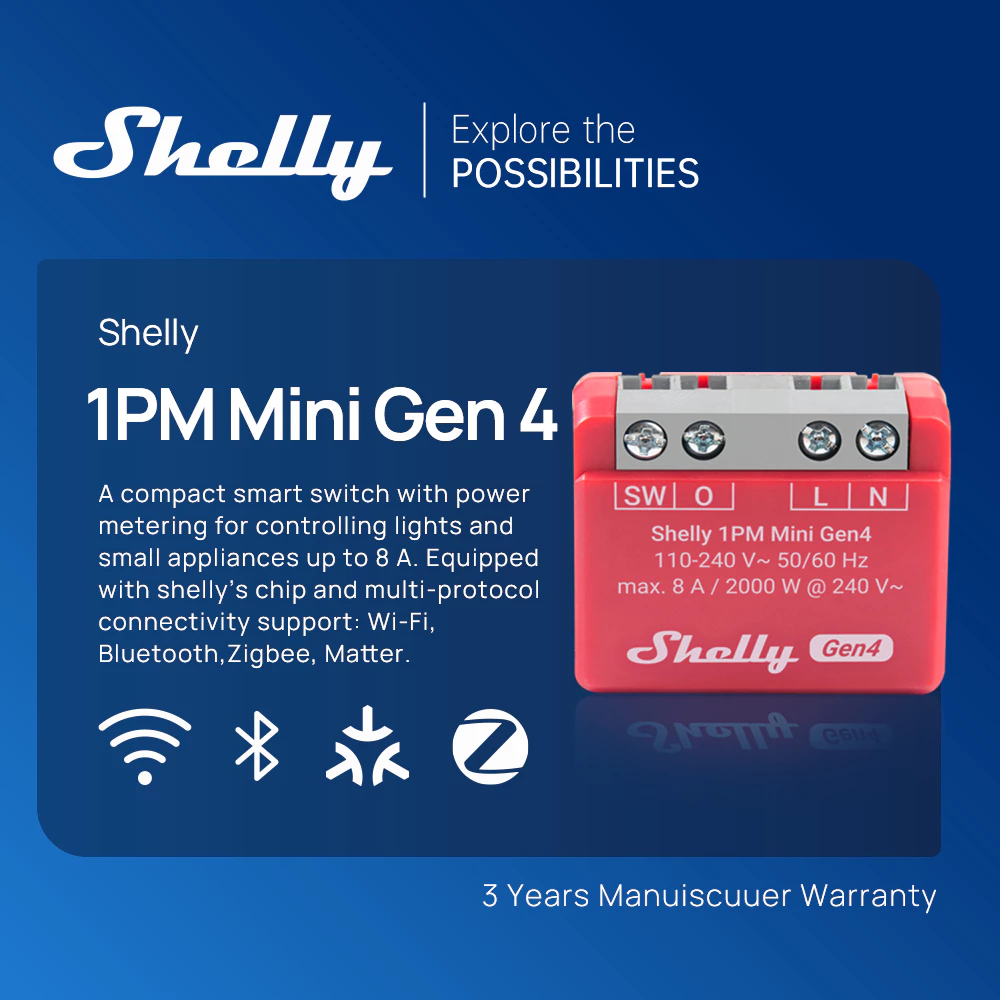 Shelly 1PM Mini Gen4 Wi-Fi Zigbee Matter Smart Relay Switch with Power Metering 1-Channel 8A Alexa, SmartThings, Google Home, Apple HomeKit Compatible